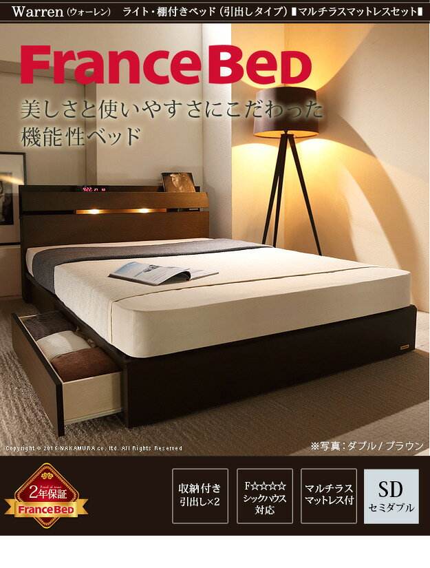 フランスベッド ライト・棚付きベッド ウォーレン 引出しタイプ セミダブル マルチラススーパースプリングマットレスセット mu-i-4700545送料無料 北欧 モダン 家具 インテリア ナチュラル テイスト 新生活 オススメ おしゃれ 後払い フレーム