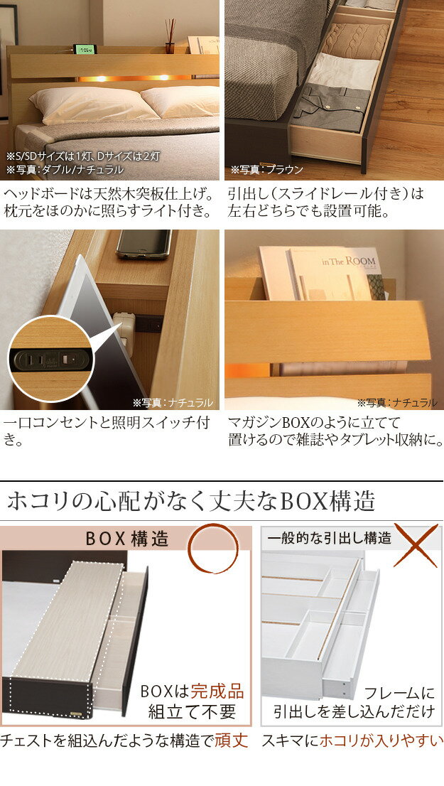 ●メーカー2年保証【セット構成】ベッドx1・マットレスx1【カラー】ブラウン・ナチュラル【仕様】■ベッド本体:天然木化粧合板(ウエンジ/タモ)・ファインセラミック塗装、プリント紙化粧合板床板:布張りコンセント:1口1500Wコード長さ:約1.7m照明:白熱灯1個10W(x1)引出:スライドレール◎組立品■マットレス張地:ポリエステル64%、綿27%、レーヨン9%中身:ウレタンフォーム、パームパッド、ポリエステル綿、防虫不織布コイル:マルチラススーパースプリング【サイズ】■ベッド外寸:幅127x奥行214x高さ81cm/約66kg床面高さ:22.5cm宮奥行:18cm■マットレス外寸:幅122x奥行195x高さ16cm/約20kg送料全国一律無料(沖縄・離島は配達不可)備考※お急ぎの場合は必ず事前に在庫確認を行って下さい。